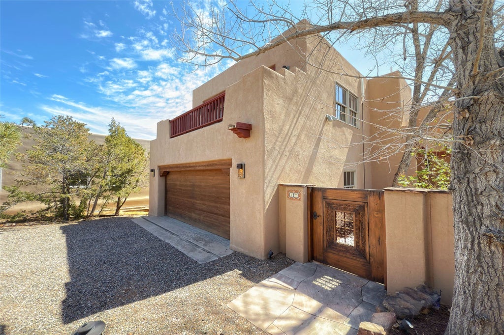 Ideal location in close proximity to Santa Fe's famous Canyon Road and renowned restaurants and boutiques. Nestled in a serene setting surrounded by piñon and juniper, this unique 4-level Santa Fe charmer combines style and comfort. Enjoy breathtaking mountain sunrise views and soak in the natural beauty from multiple level balconies. Cozy up by the wood-burning fireplace on the main floors’ living room, next to the dining room and gorgeous colorful kitchen. Equipped with a deep farmhouse sink, gas range, colorful cabinetry and backsplash, all while offering scenic views. The primary suite is located on its own level, and boasts a private balcony with sunrise views, a jetted soaking tub, and large walk-in closet. The top floor’s media room is highlighted by large built-in bookshelves, wood accents, a private balcony, and a wood-burning kiva. A true Santa Fe gem that blends architectural elegance, vibrant interiors, and panoramic views—perfect for those seeking charm and functionality in a peaceful setting. Please note, some photos are virtually staged.