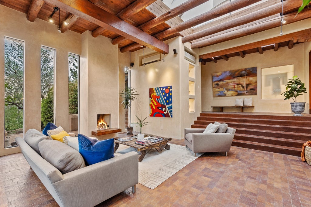 Incredible, rare, and versatile live/work opportunity off HWY 285. Situated on 11.07 acres, this unique property blends Santa Fe's old-world charm with modern style, offering a 5,481 sq. ft. main house and a 3539 sq. ft. guest house/studio. There are 4 large bedrooms, 2 full bathrooms, 3 3/4 bathrooms and 4 half-baths on the property. A large 2-car garage boosts additional space for storage and a small workshop area. Bordering the 4,000-acre Eldorado Preserve, there is also a 2,400 sq. ft. Morton barn with four oversized stalls. The remodeled main house features a European-inspired design with a gourmet kitchen, designer fixtures, and multiple Kiva fireplaces. The guest house/studio area, accessible via several entrances, includes a bright gallery space, a loft, 2 offices, and a reception space with 16-foot ceiling heights. Outdoor living areas boast covered portals, patios, and a moss rock pond, creating a serene private retreat close to shopping and amenities.