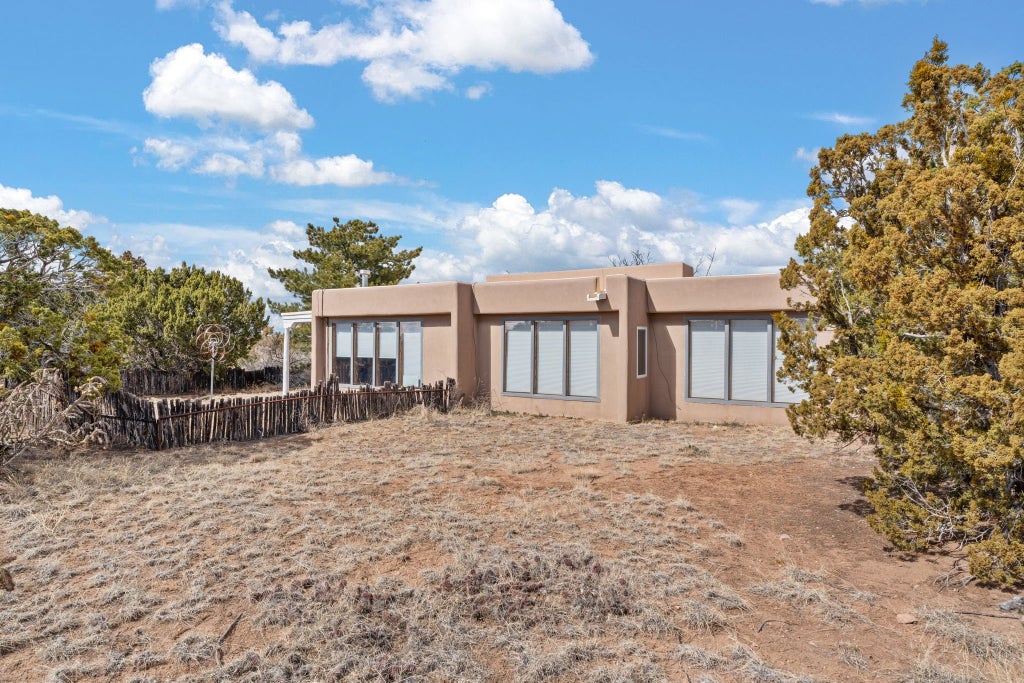 Come see this classic passive solar designed home in Eldorado, set on a private lot that backs to open space. The views are panoramic and the lot is covered with large pinon and juniper. The split floorplan includes 3 bedrooms, 2 full baths and a separate office space. Tall windows fill the spaces with light and warmth, and the beamed wooden ceilings carry throughout the house. Brick and saltillo floors complement the Southwest charm. The kitchen is open and has ample storage and stainless appliances. The living room has a gas stove and access to a covered brick patio. The TPO membrane roof was recently installed, as was the new elastomeric stucco. The Eldorado subdivision has many amenities, including a community pool and miles of hiking/bike trails. Schools, shopping and restaurants are part of the community, which also supports a local library and senior citizen center.