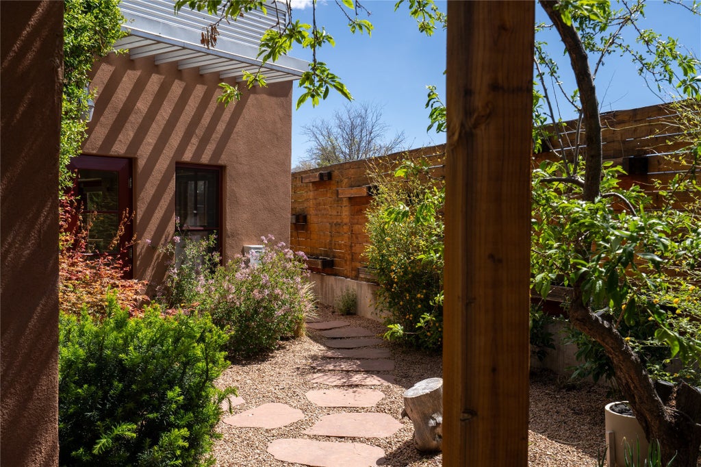Modern Adobe Retreat with Private Casita. Timeless adobe meets modern elegance in this thoughtfully designed 3-bed, 2-bath home. Open and full of light, a full bath, kitchen, open living areas, and two bedrooms are downstairs. The upstairs primary suite offers privacy, views, and a spacious balcony. Inside is serene, with exposed wooden beams, hand troweled clay walls, and in floor radiant heat. A separate 1-bed casita, complete with private entrance, open kitchen-living space, dedicated office, and private yard space will be inviting for your guests, income, or multigenerational living. Outside, mature landscaping frames every view. Dual pet doors offer ease and freedom. A domed adobe storage structure out front and a generous garden shed in the back blend with a pergola-shaded BBQ area to complement the intelligent, inviting layout. A visual palate of earth, wood, metals and light awaits. Private. Flexible. Ready to live in—or to earn.