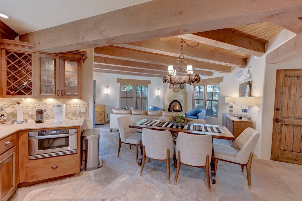 Nestled in the heart of Santa Fe's coveted historic Eastside and located off of Gonzales Rd, this elegant condo captures the essence of Southwestern living. Just a short walk from the famed Canyon Road art district, you'll find yourself perfectly positioned to enjoy the city's rich culture. Step inside to discover authentic Santa Fe style throughout this 1,352 +/- square foot retreat within a two-condo development. Admire beautiful beam and wood-plank ceilings, while gorgeous hand-hewn flagstone floors ground the space in traditional craftsmanship. The well-appointed cook's kitchen flows seamlessly into the living and dining areas, featuring thoughtful touches like a two-drawer dishwasher, convenient pot-filler, and a microwave drawer. Unwind by the kiva fireplace in the living room or step outside to your enchanting garden. This outdoor oasis boasts a hand-stacked rock wall, carved Buddha wooden gate, large, mature Wisteria vine and a soothing fountain surrounded by two distinct seating areas—all beautifully landscaped for easy care. Upstairs, the primary bedroom suite offers a private deck with lovely views, plus an ensuite bathroom featuring a double sink vanity, large soaking tub, and luxurious steam shower. Artistic details abound throughout, from wrought iron stair rails and light fixtures to hand painting on a nicho and fireplace. A charming wooden door with hand-painted Santos leads to the second bedroom, which doubles perfectly as a home office. Every room showcases custom cabinetry, doors, and true divided-light windows. Modern comforts include radiant in-floor heating, ductless mini-splits for cooling comfort, and a new tankless hot water heater. One dedicated parking space completes this package. Located minutes from Canyon Road’s galleries, world renown restaurants and the Santa Fe Plaza’s downtown attractions, this condo offers both convenience and tranquility. Whether as your Santa Fe pied-à-terre or full-time residence, this lock-and-leave lifestyle puts the best of The City Different at your doorstep. Please see the Matterport 3-D walkthrough in the listing. An extensive furniture package is available for purchase separately.