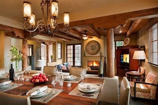 Unit 60, a spacious and stylish Montana model, spans 1,750 square feet across two levels. With 2 bedrooms, 2.5 bathrooms, and elegant Santa Fe-inspired architecture, the home features authentic touches like vigas, a cozy kiva fireplace, and hand-selected furnishings. The gourmet kitchen is fully equipped with premium appliances and cookware, ready for a quiet dinner at home or entertaining guests.