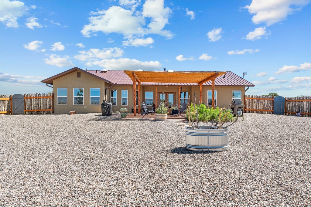 Desert Serenity with Modern Comforts – Just Outside Santa Fe. Welcome to your private oasis nestled on 4 sprawling acres of high desert beauty just minutes from historic town on Lamy NM and close to Santa Fe. This stunning single-level, 4-bedroom home—built in 2021—blends contemporary design with the timeless charm of New Mexico living. Highlights include: A sleek pitched metal roof that complements the natural surroundings and offers superior durability. Spacious, open-concept living area perfect for entertaining or relaxing. A large walk-in pantry offering ample storage and culinary convenience. Breathtaking sunset views that paint the sky in dramatic hues each evening. A beautifully landscaped private patio—ideal for quiet mornings or lively gatherings under the stars. With thoughtful architecture, Central AC, serene vistas, and plenty of room to roam, this property is more than just a home—it's a lifestyle. Enjoy peaceful solitude, vibrant skies, and the cultural richness of Santa Fe just a short drive away.