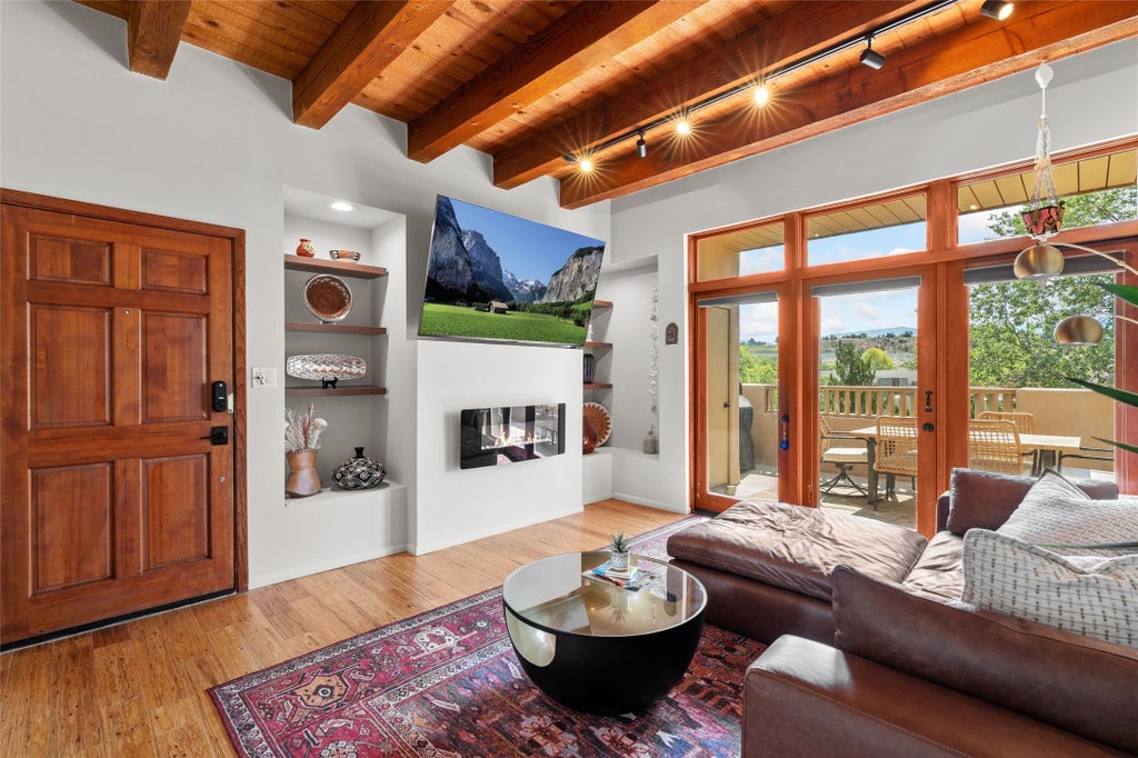 Charming 1-bedroom, 1-bath condo located in the convenient Viento del Norte Condominiums. This end unit offers a unique advantage with no neighbors on the north side, allowing for an abundance of natural light to fill your living space through extra windows. Bright and inviting interior flows seamlessly into a spacious balcony, nearly doubling your entertaining area. Imagine hosting friends and family as you enjoy the beautiful Santa Fe weather! The condo features elegant wood and tile floors, complemented by square-cut beamed ceilings that add a touch of rustic charm. The wood-framed glass doors enhance the open feel and bring the outdoors in. Create a relaxing atmosphere in the evenings by the stylish fireplace with glowing flames by touch of a button. The galley kitchen showcases white cabinets paired with butcher block countertops. A stacked washer/dryer is in the large pantry/storage area. This condo includes both assigned parking and a one-car garage downstairs, offering added value and ease. Just minutes from the Devargas Center and downtown Santa Fe. An ideal condo for a seasonal foothold in Santa Fe, a profitable rental property, or a carefree home in a prime part of Santa Fe.
