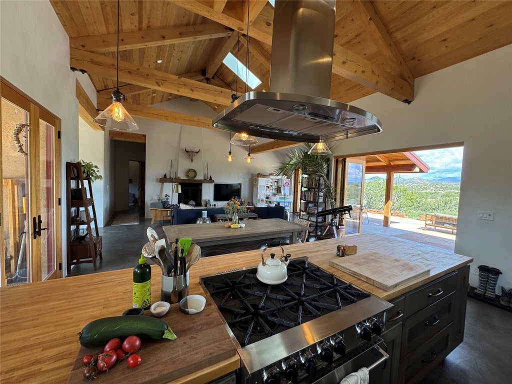 DREAMY LIVING SPACES: The open living area is a total vibe, with natural light pouring in, gorgeous, modern, polished walls, and wood beams that give it that true Santa Fe charm. Plus, the kiva fireplace is perfect for cozy nights in.