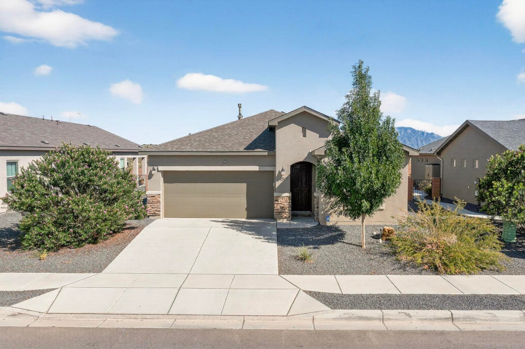 More house for your money! Easy commute to Santa Fe or Los Alamos, or take the Rail Runner! This House is Like New! The seller is offering 1% of the purchase price toward a buyer's interest rate buydown. Welcome to your Rio Rancho oasis! Nestled in the desirable Mountain Hawk subdivision, this stunning 4-bedroom, 2-bath home, built in 2022, offers the perfect blend of modern style and comfort. The open floor plan and high ceilings create a bright and airy feel. The chef's kitchen features elegant marble countertops and a spacious island. The tranquil primary suite has a private en-suite bathroom with a large walk-in closet. Three additional bedrooms provide plenty of space for family, friends, or an office. Fully landscaped, low maintenance front and back yards, and a covered patio provide an enjoyable outdoor space. This property is in excellent condition. Don't miss this exceptional home!