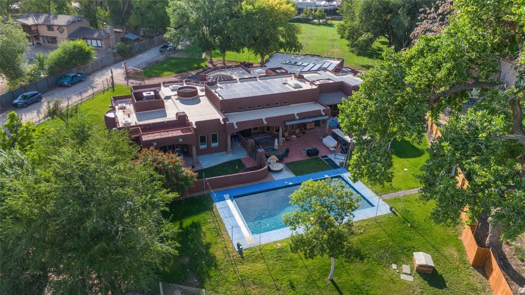 IMAGINE WAKING TO THE BOSQUE'S COTTONWOODS AT YOUR DREAM HOME! Nestled on a quiet cul-de-sac in NM's coolest village with PAID OFF SOLAR, this custom adobe exudes luxury. Sunlight streams thru clerestory windows and beam ceilings, lighting travertine floors in a vast great room with a fireplace. The gourmet kitchen boasts granite counters, prep sink, WOLF six-burner cooktop, oven, micro, and warming drawer—its huge island ideal for gatherings. A separate outdoor kitchen awaits. The master suite features a loft for an office, plus a spa-like bath with steam shower, jetted tub, and double sinks. Four beds + office and 4.5 baths ensure room for all. Pella windows frame deck views; a heated 4-car garage awaits. Dive into the inground pool or relax on an open patio. Seize the day and call!