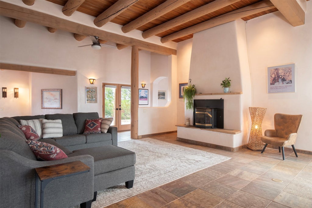 Set on 15 private acres with commanding forever views, this exceptional property combines the best of rural living with a strong sense of community & a lifestyle that embraces the outdoors. The main home offers nearly 3,500 square feet of living space, complemented by an attached 1,100 square foot ADU/guest house. Perfect for independent living, extended family, private guest quarters, a home office, or potential rental income, the guest house provides both flexibility & privacy. Inside the main residence, classic Santa Fe charm shines throughout. A spacious chef’s kitchen is the heart of the home, while high ceilings with cedar latillas, hard trowel plaster walls, and multiple kiva fireplaces add warmth and character. A pellet stove ensures cozy comfort. Outdoor living takes center stage in every direction. Whether gathering around the kiva fireplace, relaxing on the patios, or entertaining on the elevated margarita deck with 360-degree sunset views, this property was designed to connect with nature & wide-open skies. Adding to its appeal, the home is equipped with green energy features including a Tesla Powerwall and a solar array, ensuring minimal electric costs while supporting sustainable living. This rare offering blends timeless Southwestern design with modern energy efficiency and endless opportunities for living, working, and entertaining—truly Rancho Alegre country living at its best.
