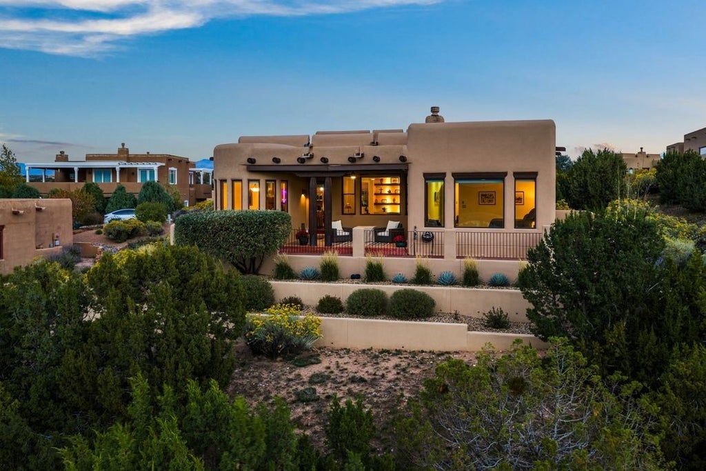AMAZING VIEWS! Panoramic golf course, lake, Jemez Mountain and sunset views from this beautiful 3 bedroom & 2 bath Las Campanas home. Situated on an elevated lot overlooking the 14th fairway of the Jack Nicklaus designed Sunset Golf Course, this thoughtfully designed home is ideal as a permanent residence or turn-key second home. Wonderful open concept living is anchored by the cozy kiva fireplace on one end…and on the other a beautiful chef’s kitchen where you’ll find the spacious island with hammered copper farmhouse sink, top of the line appliances, generous pantry and beautiful dining area. Expansive windows capture the views, with French doors leading out to your covered portal for ideal outdoor entertaining. Your spacious Primary Suite enjoys those same incredible views and access to the portal, a spa-inspired bath featuring a jetted tub, walk in shower, double vanity and generous walk in closet. The Guest accommodations are nicely separated for privacy. Beautiful design features throughout… niches and built in shelving to showcase your art, classic vigas, cozy built in seating, roll down sun shades, custom doors & custom cabinetry. Additional highlights include new roof installed 2024 (transferable warranty), new refrigerator, new hot water heater, new patio railings and courtyard gates. Make this your ideal Santa Fe retreat!