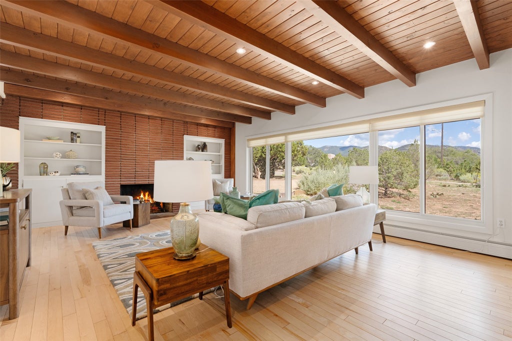 Set apart from the ordinary and just 2.5 miles from the Santa Fe Plaza, this striking custom Stamm home blends classic Northern New Mexico pitched-roof architecture with timeless Santa Fe charm. Sited on a generous 0.70-acre lot with expansive views of the foothills and Ortiz Mountains, this home offers a rare sense of space and privacy — all while keeping you close to the heart of town. Thoughtfully renovated throughout, the main residence features three bedrooms, wood floors, and a warm, wood-plank ceiling with exposed beams. The living room centers around a charming brick fireplace flanked by custom bookcases, and the stylish kitchen boasts cool glass tile backsplash, great gas cook top, ample storage, and even a wood burning fireplace for ambiance. The sunlit primary suite includes California Closets and a beautifully modern bath with a large walk-in shower. A fully operational photovoltaic solar system helps keep energy costs low. A standout feature of the property is the detached 750-square-foot studio — complete with its own 100-amp service, ¾ bath, soaring ceilings, custom wrought iron doors, and an upstairs loft (not included in the listed square footage). Whether you're an artist, entrepreneur, or simply seeking bonus flex space, this studio delivers. Recent improvements include a Propanel roof, new Anderson windows, high efficiency tankless water heater, remodeled bathrooms, new tile and wood flooring, updated kitchen countertops (2024), all-new interior lighting (2023), and fresh paint throughout (2025). This is a one-of-a-kind offering that feels private and peaceful — yet is mere minutes from galleries, dining, and all the cultural vibrancy of downtown Santa Fe.