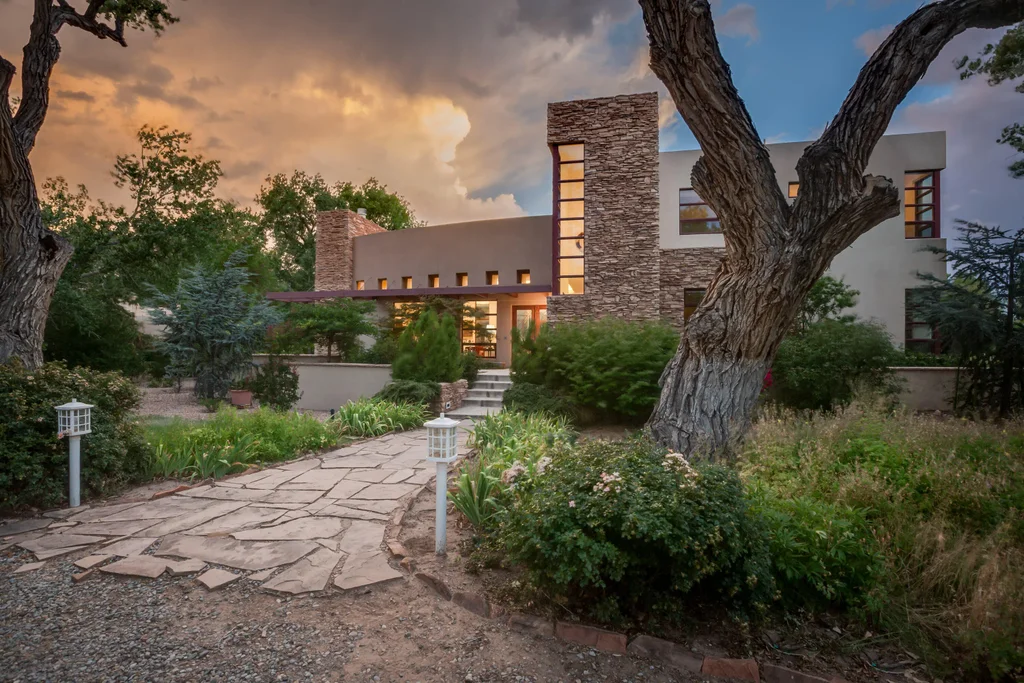 Amazing Value. Best priced home in Bosque Encantado! Dynamic, contemporary custom home set among age old Cottonwoods in gated Bosque Encantado. Just 30 minutes to Santa Fe! Elements of glass, wood, and stone in a beautiful design featuring light filled great room with mahogany floors, fireplace & access to elegant pool space with kitchen - an entertainer's dream! Elegant formal dining.Gourmet kitchen w/Wolf range, plenty of counters & cabinets,vegetable sink, baking center & walk-in pantry. 1100 bottle wine cellar. Designed for privacy, 2 bedrooms, one with private bath in one wing on main floor plus office. Opposite side 2nd flr includes library & luxurious primary suite including 2 closets & sitting area & spacious bath & decks. Oversized 3 car gar + wrkshp. 1 AC lot. Spectacular!