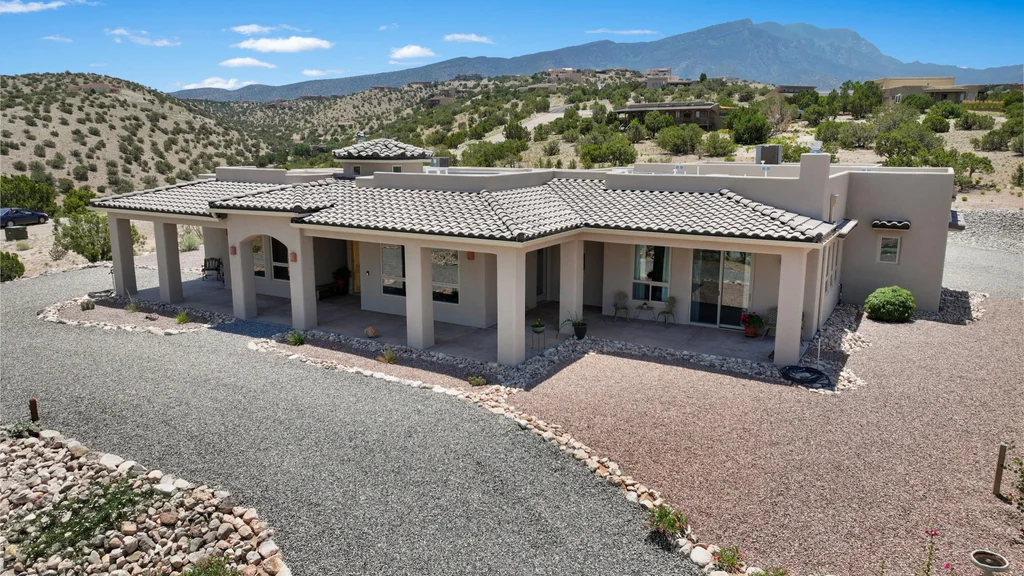 This beautifully crafted custom home is perfectly situated near the end of a dead end street, and across from BLM land in Placitas. This property is surrounded by the spectacular views of several mountain ranges, black mesas, and cabezon peak. With an open and functional floor plan, this 3-bedroom, 2.5-bath property is designed for comfortable living and effortless entertaining. The inviting living room radiates warmth and comfort, creating a space where you instantly feel at home. The kitchen offers, granite counter tops, 2 sinks, a double oven, a custom engraved steel backsplash behind the built in range, and a walk in pantry. The spacious primary suite includes a large walk in closet and spa like bathroom. Enjoy panoramic views of mountains and breathtaking scenery!