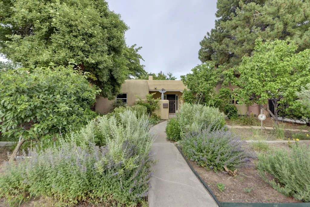 Spacious UNM AREA home that combines the best of traditional southwestern architecture and contemporary style. The front section of the house is a real adobe with a kiva fireplace in the LR and beamed ceiling in the LR and 3 bedrooms. 3 new solar tubes provide extra light. The rear of the home is a gorgeous addition with an open floor plan, high ceilings & clerestory windows. Travertine floors in majority of home. Open kitchen has attractive cabinets, ample counter space and a bar. Spacious primary bedroom with walk in closet and generously sized bathroom. CFA + refrigerated cooling. Thermal windows. New water heater. Large 2 car garage. Lush landscaping front and back. Private front courtyard. Shady private backyard. Organic soil . Quiet street w/ easy access to UNM & Summit Park.