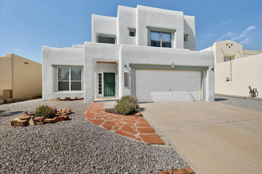 This beautiful home blends Southwestern charm with modern touches such as its split staircase and french doors opening to the inviting backyard. The kitchen features light grey cabinetry, gold-tone fixtures, a unique turquoise island, and updated appliances--including washer and dryer. The open floor plan flows into a bright living area with a cozy kiva fireplace. The spacious primary suite offers a stylish bath and Sandia Mountain views, while secondary bedrooms provide flexibility for guests or office space. Relax in your own outdoor oasis featuring a grassy area and backyard access for recreation. Conveniently located near shopping, dining, and commuter routes, this home is move-in ready!