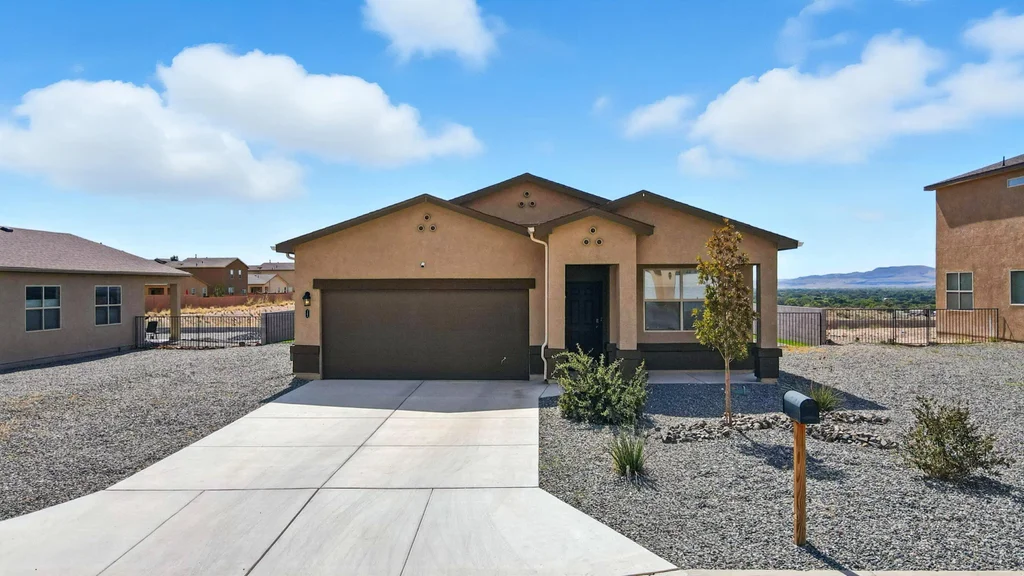 Discover this move-in ready 3-bedroom gem in Los Lunas, only 3 years old with upgrades including custom tile work in the kitchen, new window treatments, and backyard landscaping. On nearly a quarter-acre lot, this home offers space and privacy without neighbors right on top of you. Best of all, there are no backyard neighbors and never will be, providing lasting peace and seclusion. The landscaped yards feature a low-maintenance backyard with fruit trees: apple, plum, cherry, nectarine, and peach. Enjoy the extended covered and uncovered patio, perfect for a hot tub or pergola. Inside, the open floor plan highlights a spacious kitchen with island, stainless appliances, and washer/dryer. The split primary layout ensures privacy, while the dining area offers a built-in buffet and cabinets.