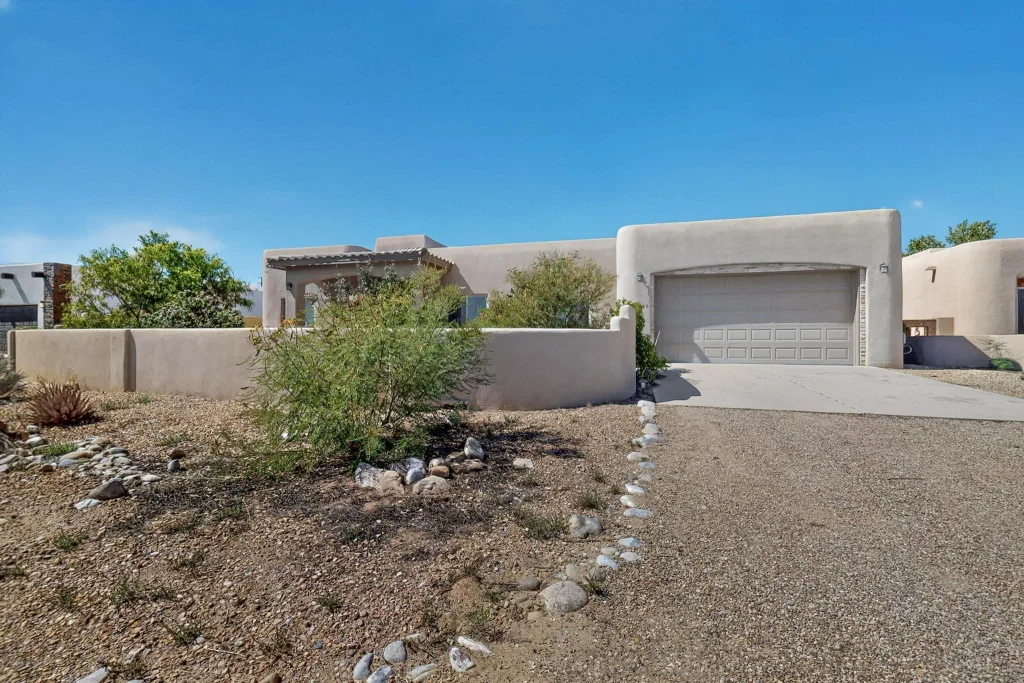 Charming Southwest-Style GEM with HUGE BONUS GARAGE! This 3-bedroom home on a half-acre lot combines comfort, character & versatility in a serene New Mexico setting. Featuring warm architectural details like beautiful wood vigas, accent beam & corbels, custom floor to ceiling fireplace & raised ceilings. Primary suite provides a quiet retreat with a step-in shower & large walk-in closet. 2 additional bedrooms offer flexibility for guests, home office or hobby space. Outdoors, enjoy wide-open skies & room to roam, with plenty of space for gardening, entertaining or simply relaxing on the covered patio. In addition to the attached garage, includes a separate detached garage at back of property (approx. 745+/- SQ. FT.). TPO roof & solar too! Appliances STAY. Come see this Southwest beauty!