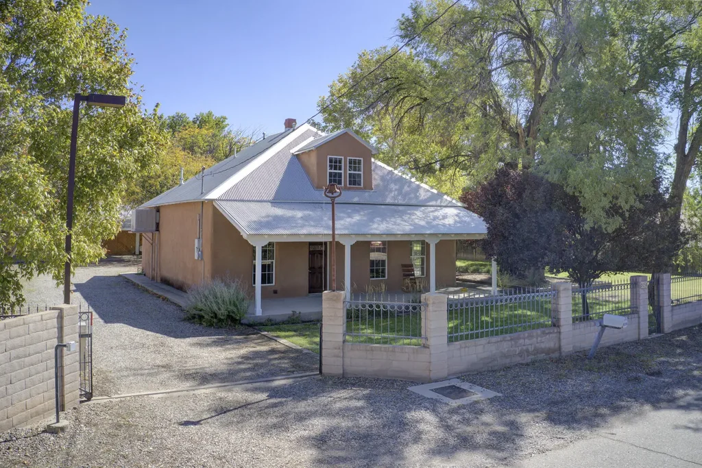 Magnificent Architecturally Significant Terrone Adobe Home nestled on 1+ Acre of Lush Greenbelt! Acequia+Water Rights! The Home was thoughtfully Updated w/ Modern Amenities while honoring the Home's Impressive Heritage & Historic Charm!Original Wood Beam T&G ceilings! Main Home is 2256 SF! Main Level BR or Flex room w/French Doors! Spectacular Living Room! Inviting Kitchen w Granite Counters/Tiffany Style Lights/Big Island! French Doors beckon you to enjoy the Outdoor Oasis! Owner's Suite offers 3/4 Bath+ View Windows! Ideal For Multi generational living or as Income Property- offering a 1373 SF 2nd home! Fantastic 1366 SF Garage/Workshop offers 4 car parking+office+ R/I for Bath! Lush Landscaping! Grass/Large Shade Trees/Pecan Trees/Chicken Coop Palace!Truly A Rare Opportunity!